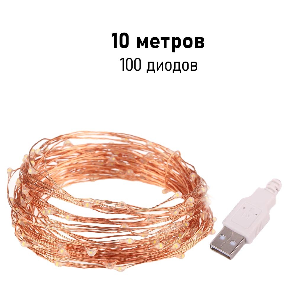 Нить "Роса" медь, 10 м х 100 диодов, от USB, теплый белый