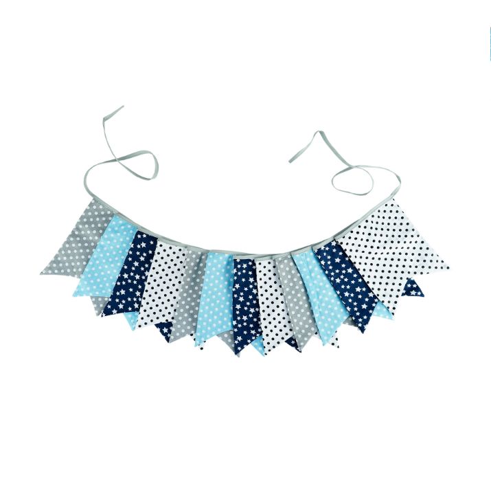 Гирлянда состоит из 12 флажков, общая длина составляет 3,4 м, расстояние между флажками 3 см, длина матерчатых флажков 2,1 м, длина лямок с обеих сторон по 50 см