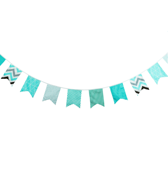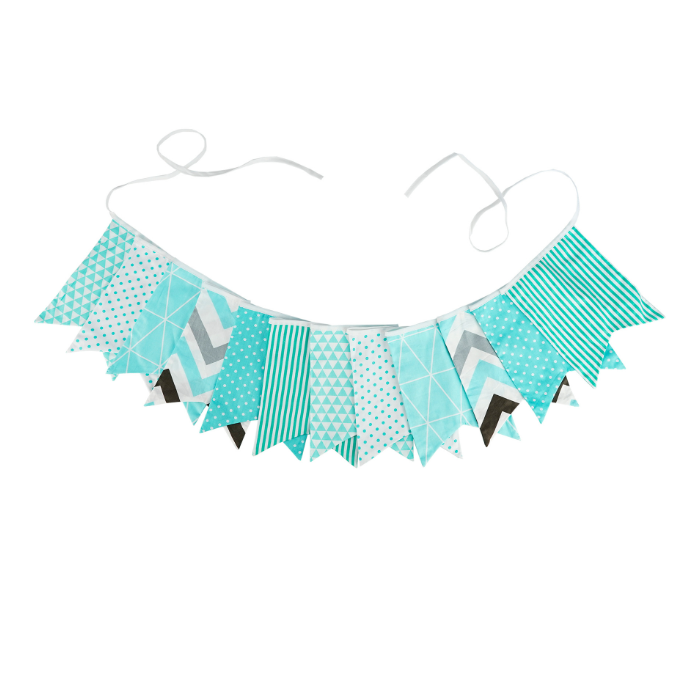 Гирлянда состоит из 12 флажков, общая длина составляет 3,4 м, расстояние между флажками 3 см, длина матерчатых флажков 2,1 м, длина лямок с обеих сторон по 50 см