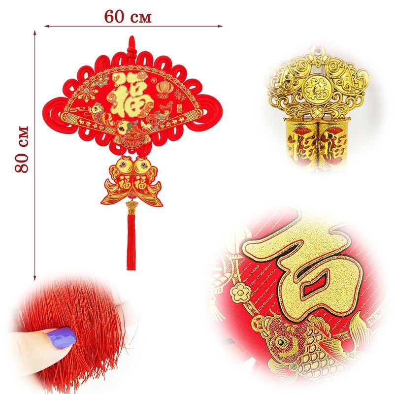 Традиционный китайский узел в форме ромба с символичным дизайном. Яркое сочетание красного бархата и золотых элементов создает эффектный акцент в интерьере.
