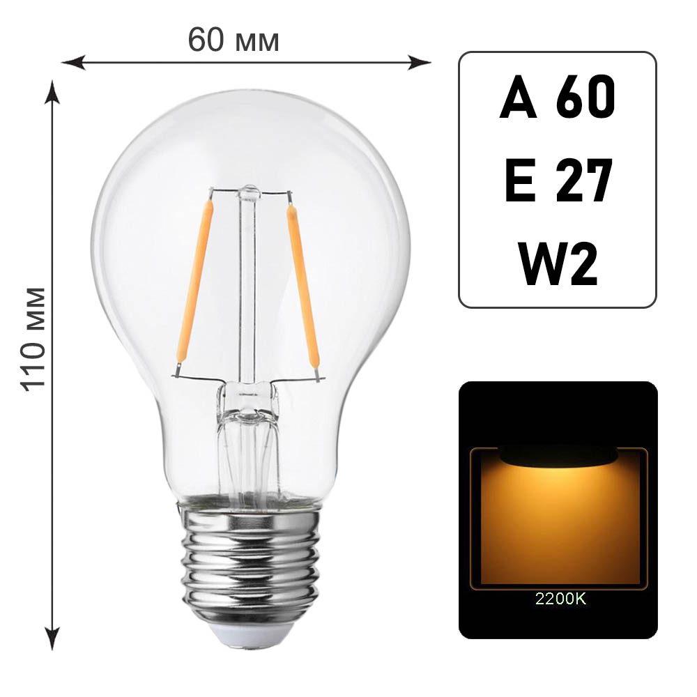 Лампа светодиодная A60 E27 W2 – отличный выбор для гирлянд и декоративного освещения. Свет теплотой 2700 K. Преимущество таких ламп очевидно – потребление электроэнергии у них в 8 раз меньше, чем у классических ламп накаливания. Заявленный срок службы составляет не менее 25 тысяч часов. Класс энергоэффективности A++.