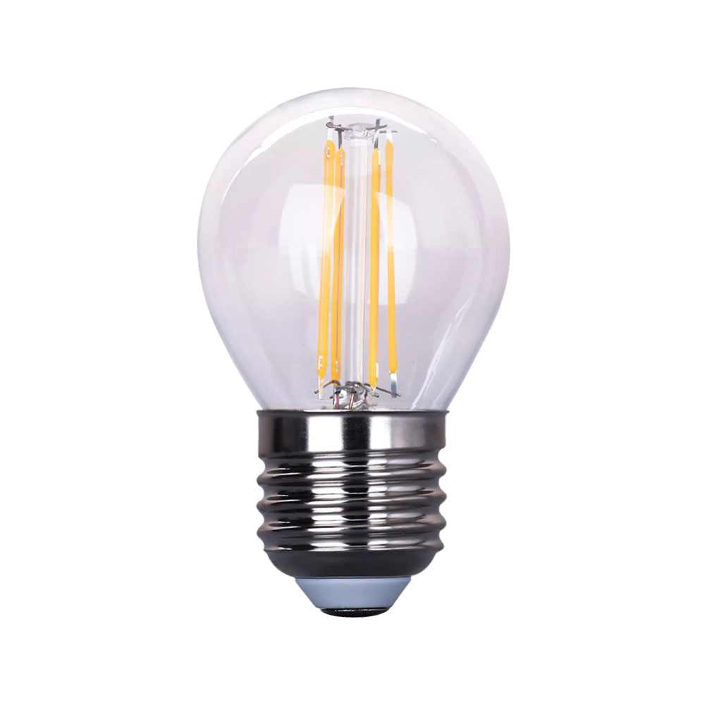 Лампа светодиодная стандарта G45 E27 с мощностью 4Вт. Яркость свечения сопоставима с традиционными лампочками 20Вт. Свечение 210 люменов, 2700 К дарит приятную теплую атмосферу. Является декоративной и используется в гирляндах и светильниках как внутри, так и снаружи помещений. Длительность работы – до 30 000 ч. Не содержит вредных для экологии соединений. Класс энергоэффективности A++.