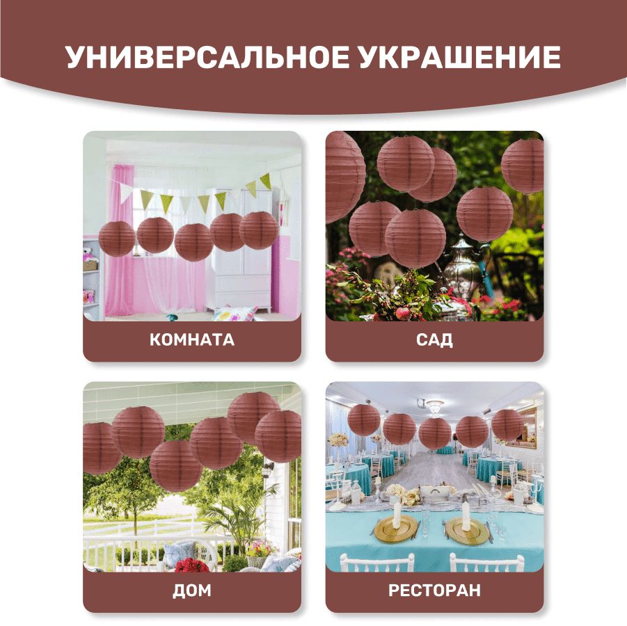 В комплект входит 8 бумажных фонариков и лента атласная.