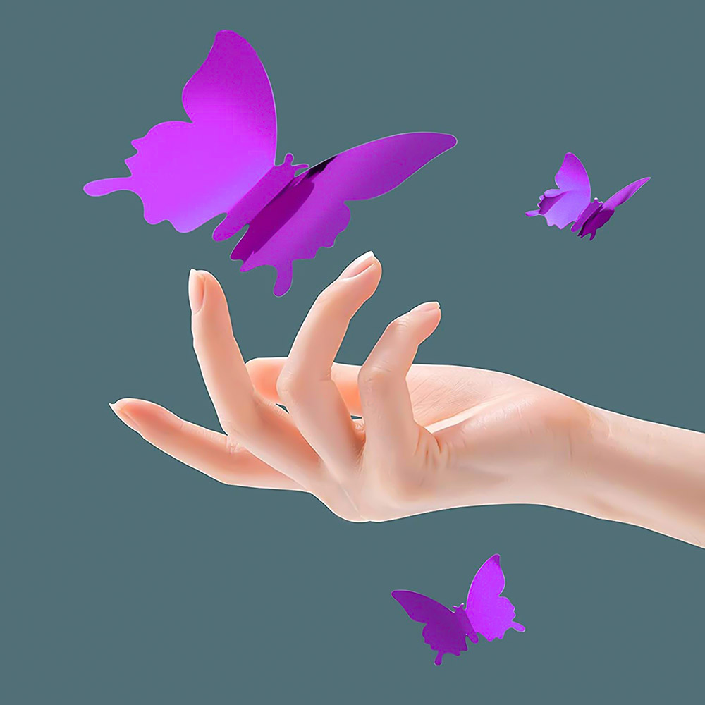 Пластиковые бабочки, двухцветные с внутреней стороны серебро, крепятся с помощью двухсторонней клейкой ленты, которая идет в комплекте.