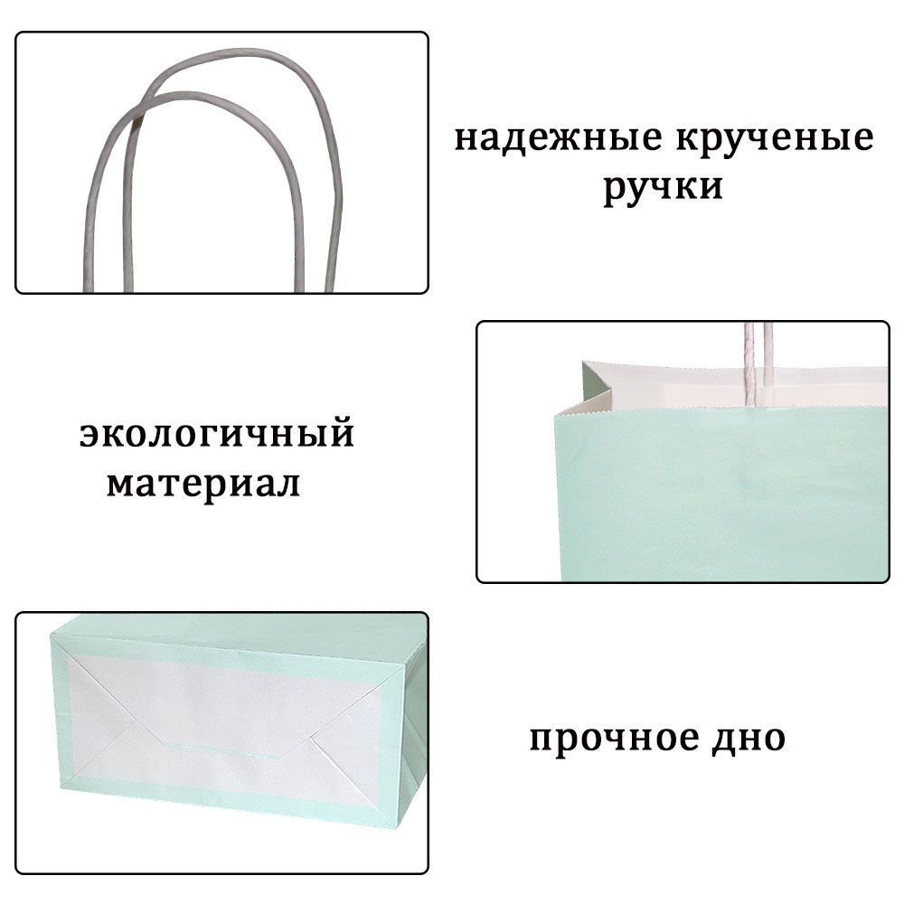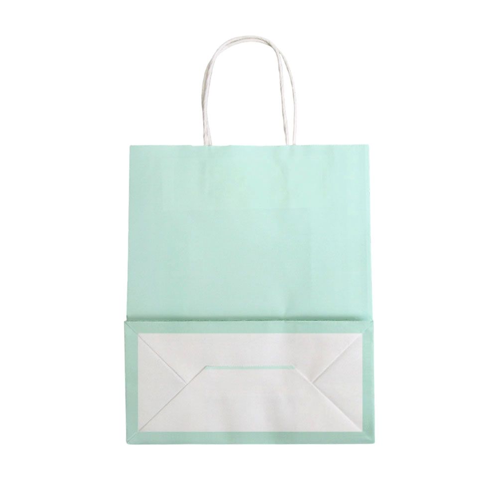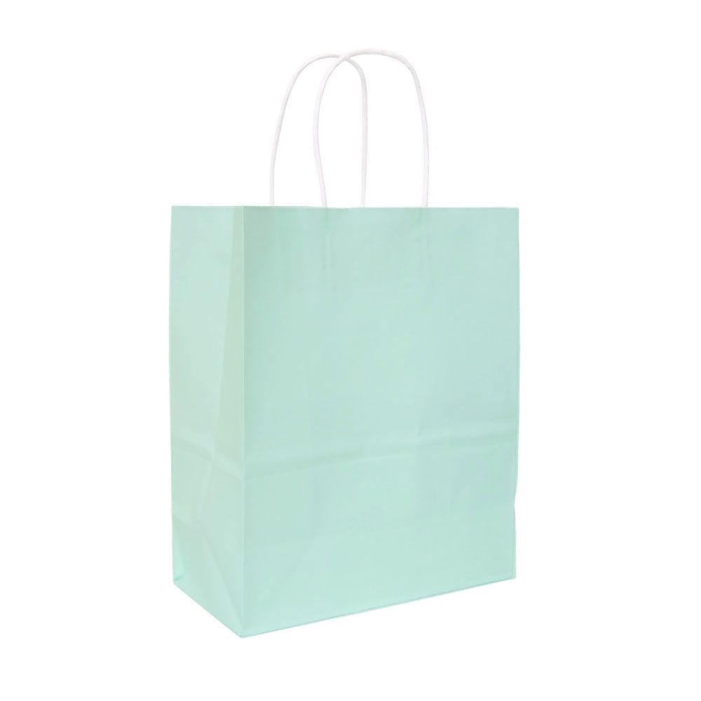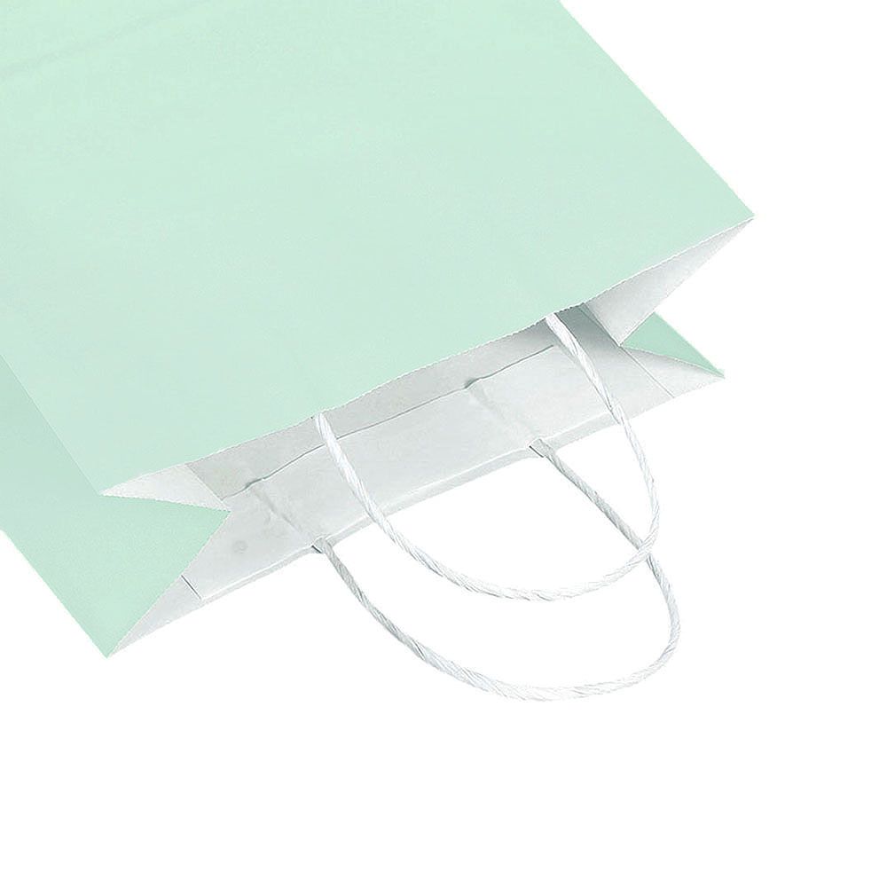 Подарочный пакет из крафтовой бумаги пастельного оттенка с белыми бумажными ручками и белой внутренней стороной.