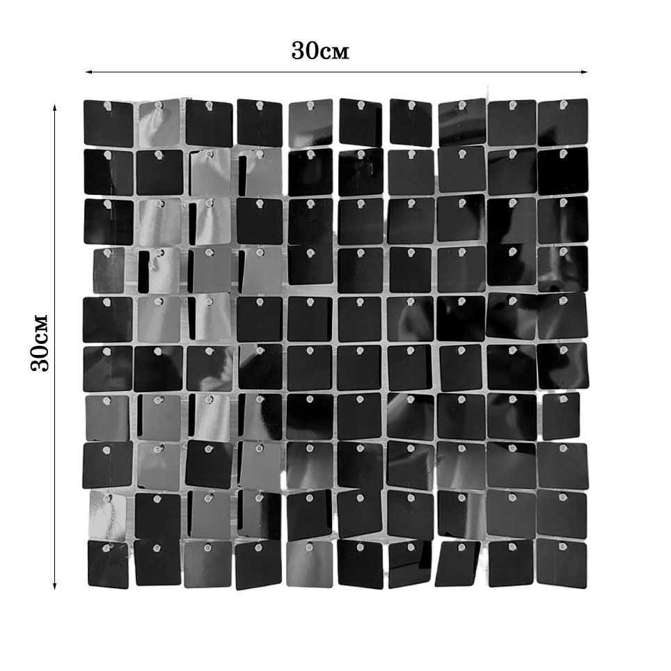 Панель с пайетками 30×30 см на гибкой пластиковой основе. Пластик прочный, хорошо гнётся и не ломается при сгибании. Пайетки переливаются при движении. Панель крепится к стенам, каркасам или соединяется с другими такими же панелями.