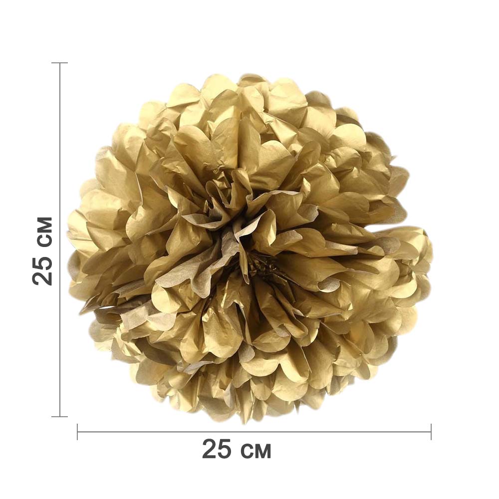 Золотой бумажный помпон диаметром 25 см — стильное и лёгкое украшение для праздников, фотозон, витрин и интерьера. Отлично подойдёт для дней рождений, свадеб, вечеринок и тематических мероприятий.