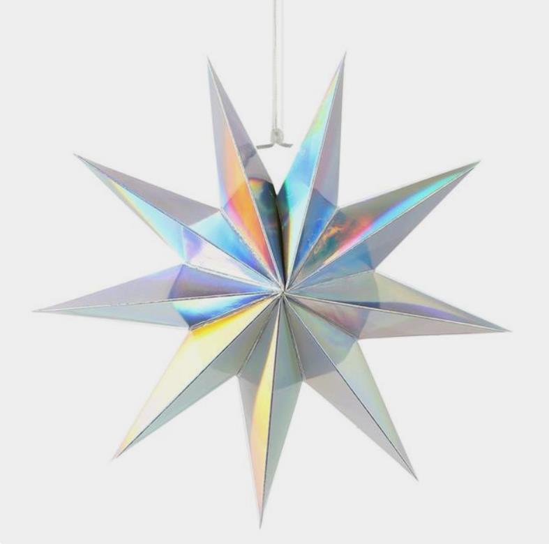Объёмная декоративная звезда из картона диаметром 30 см с 9 лучами. Оснащена встроенным шнурком для подвешивания. Поставляется в компактном сложенном виде и быстро собирается: специальный шнурок при затягивании придаёт изделию объём и фиксирует форму. После сборки звезда остаётся устойчивой без дополнительных креплений и может использоваться многократно.