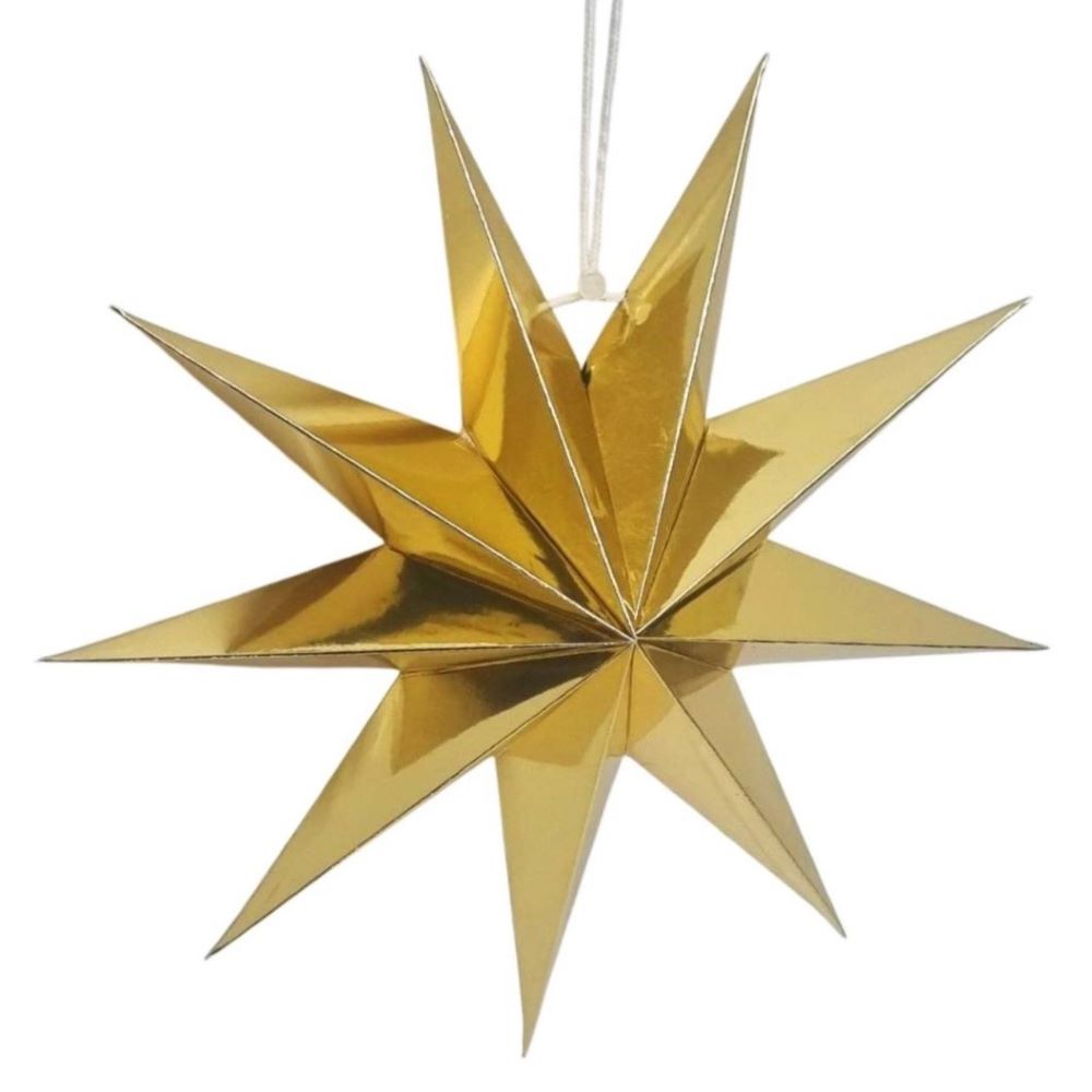 Объёмная декоративная звезда из картона диаметром 30 см с 9 лучами. Оснащена встроенным шнурком для подвешивания. Поставляется в компактном сложенном виде и быстро собирается: специальный шнурок при затягивании придаёт изделию объём и фиксирует форму. После сборки звезда остаётся устойчивой без дополнительных креплений и может использоваться многократно.